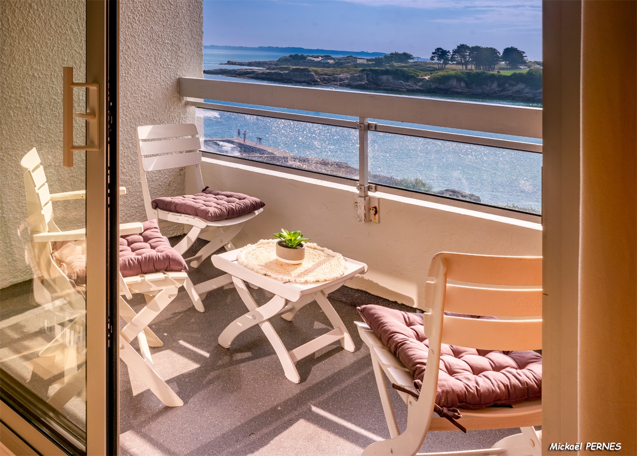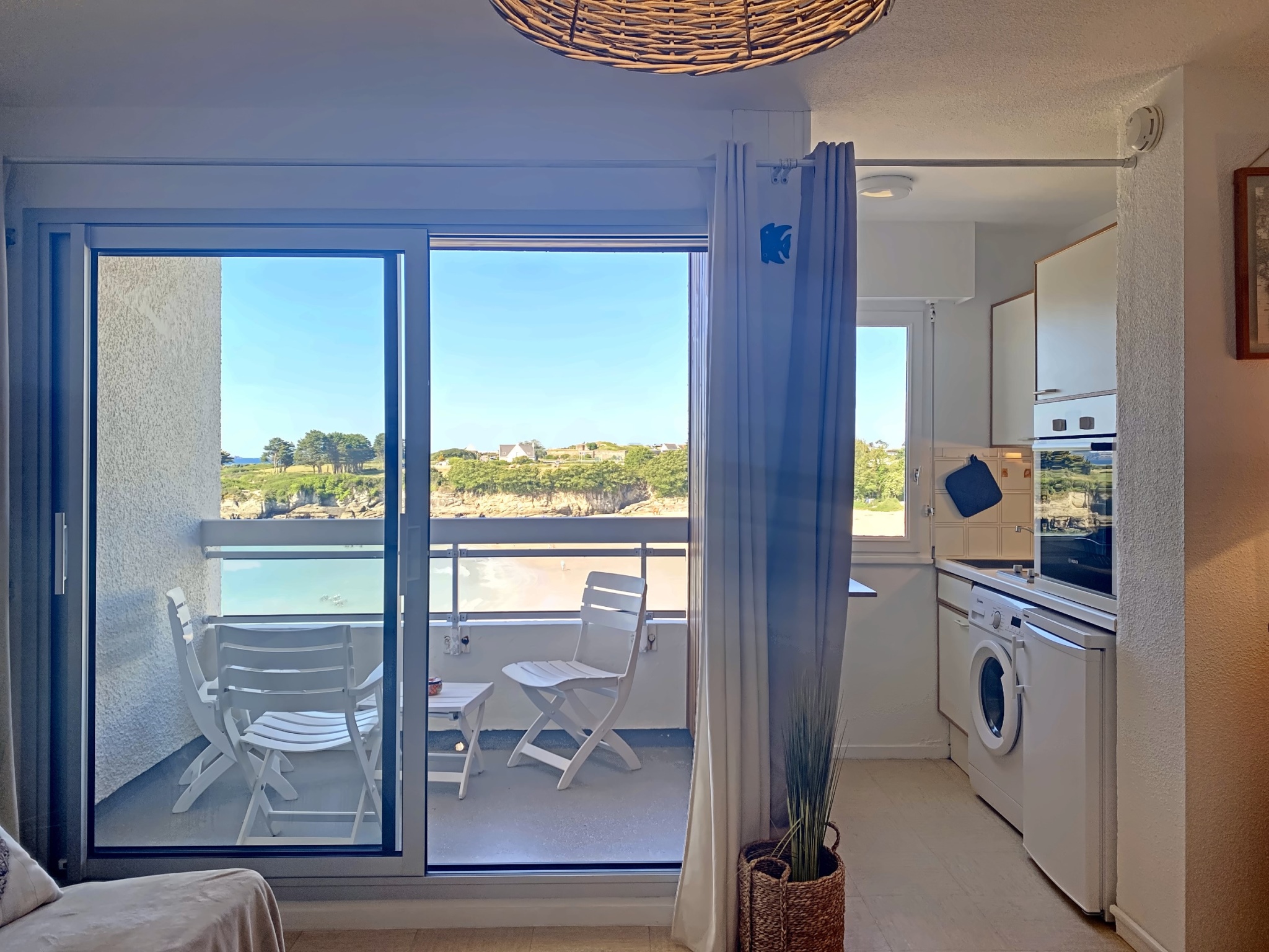 PLŒMEUR - RÉF 214 visite virtuelle sur site agence ou sur demande - 2 à 3 couchages - les pieds dans l'eau et à 2 Kms des commerces. Lomener, la situation exceptionnelle en front de mer de la résidence bien entretenue 'Les Balcons de la Plage', permet d'allier les plaisirs de la plage, baignade, promenade sur sentier côtier et des lumières magiques sur océan avec en fond l'île de Groix. Cet appartement de type 2 d'env 35m2 situé au 2ème étage, comprend une entrée avec cagibi, un séjour avec clic-clac donnant sur balcon pleine vue mer et plein sud avec coin cuisine aménagé et équipé (frigo top, plaque 2 feux, hotte, four, micro-ondes et machine à laver), une chambre avec lit 140, salle de bains, et WC indépendant.