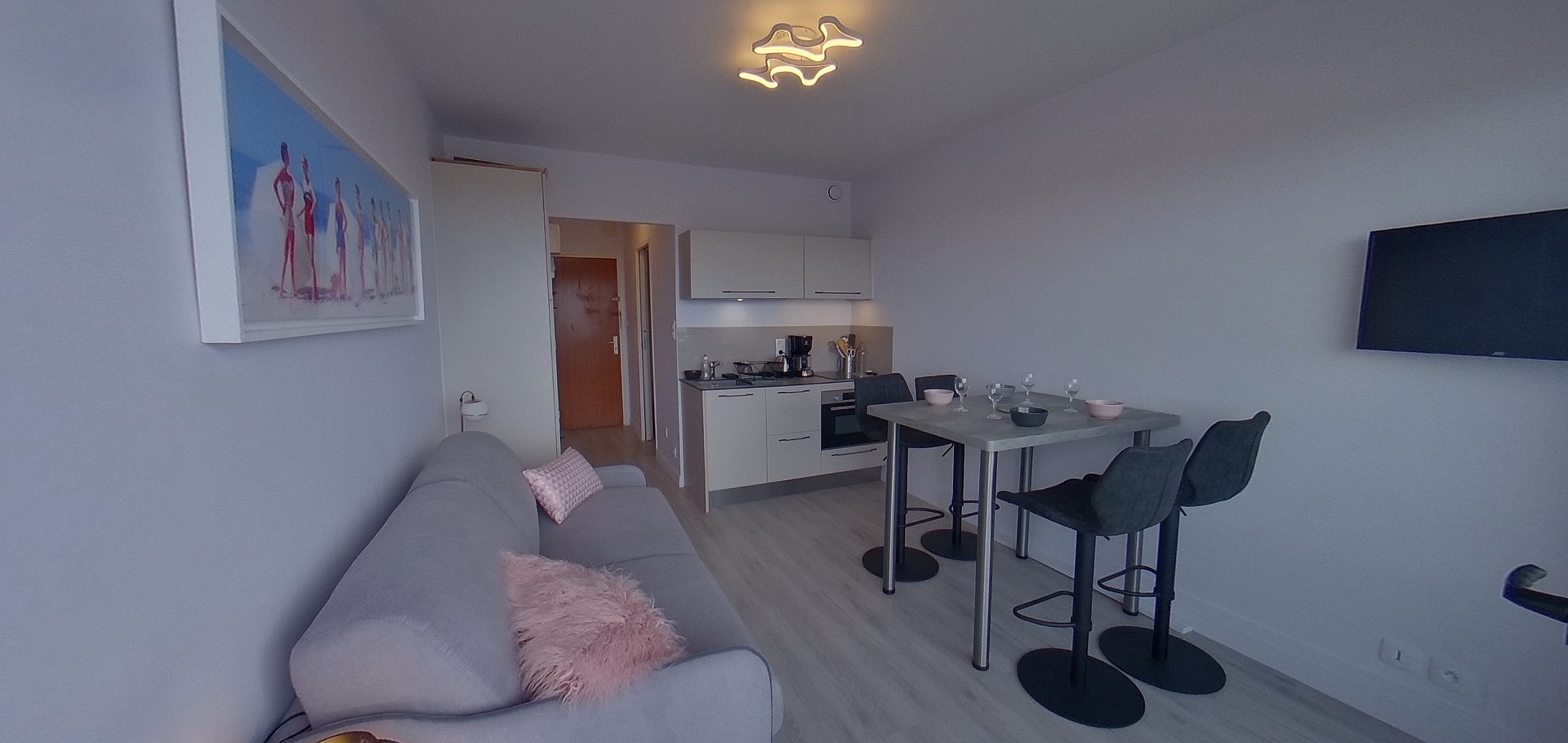 Studio entièrement rénové. Situé au 1er étage de la résidence, il comprend une entrée avec placard, une pièce à vivre (1 canapé convertible 140) donnant sur le balcon équipé de mobilier avec TV, d’un coin cuisine aménagé et équipé (réfrigérateur, plaques, combiné four/micro-ondes), d’une salle d’eau avec WC et lave-linge. Local commun à vélo. WIFI incluse.