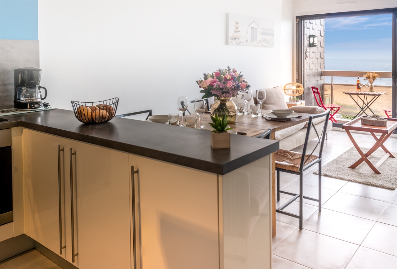 PLŒMEUR RÉF 320 appartement de type 3 vue mer - capacité 4/5 couchages - Emplacement idéal à 30m des commerces et accès direct à la plage. Lomener, dans la résidence Le Bod Skau, cet agréable appartement 3 pièces, est situé au 3ème étage avec ascenseur. Il se compose d'un spacieux séjour donnant sur balcon avec magnifique vue mer, cuisine ouverte entièrement aménagée et équipée (frigo, plaques induction, four, micro-ondes, lave-vaisselle), d'un dégagement, d'une chambre avec un lit 140 et placard, d'une 1 chambre avec 2 lits 90 superposés et un lit tiroir, une salle d'eau, un WC indépendant.
