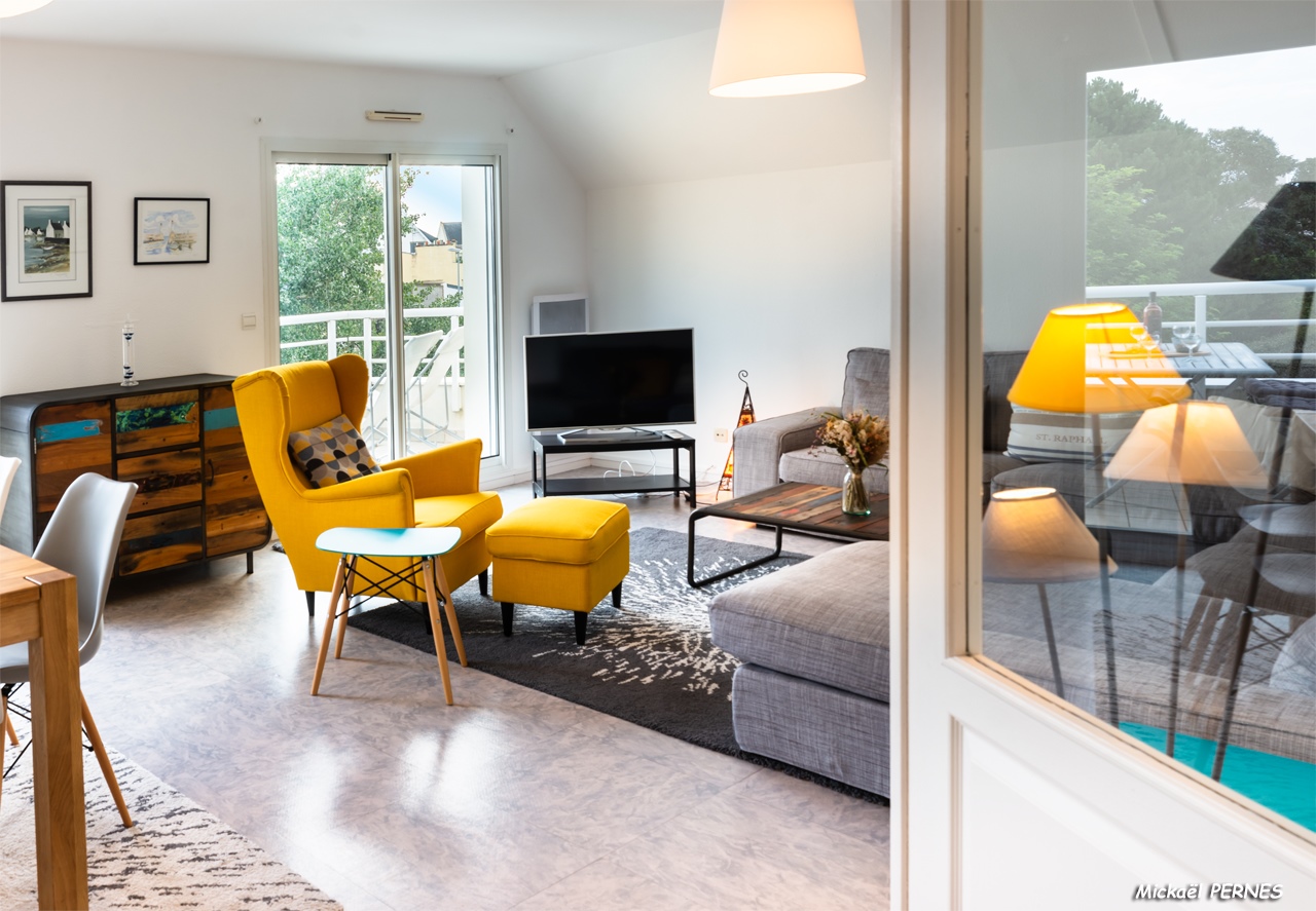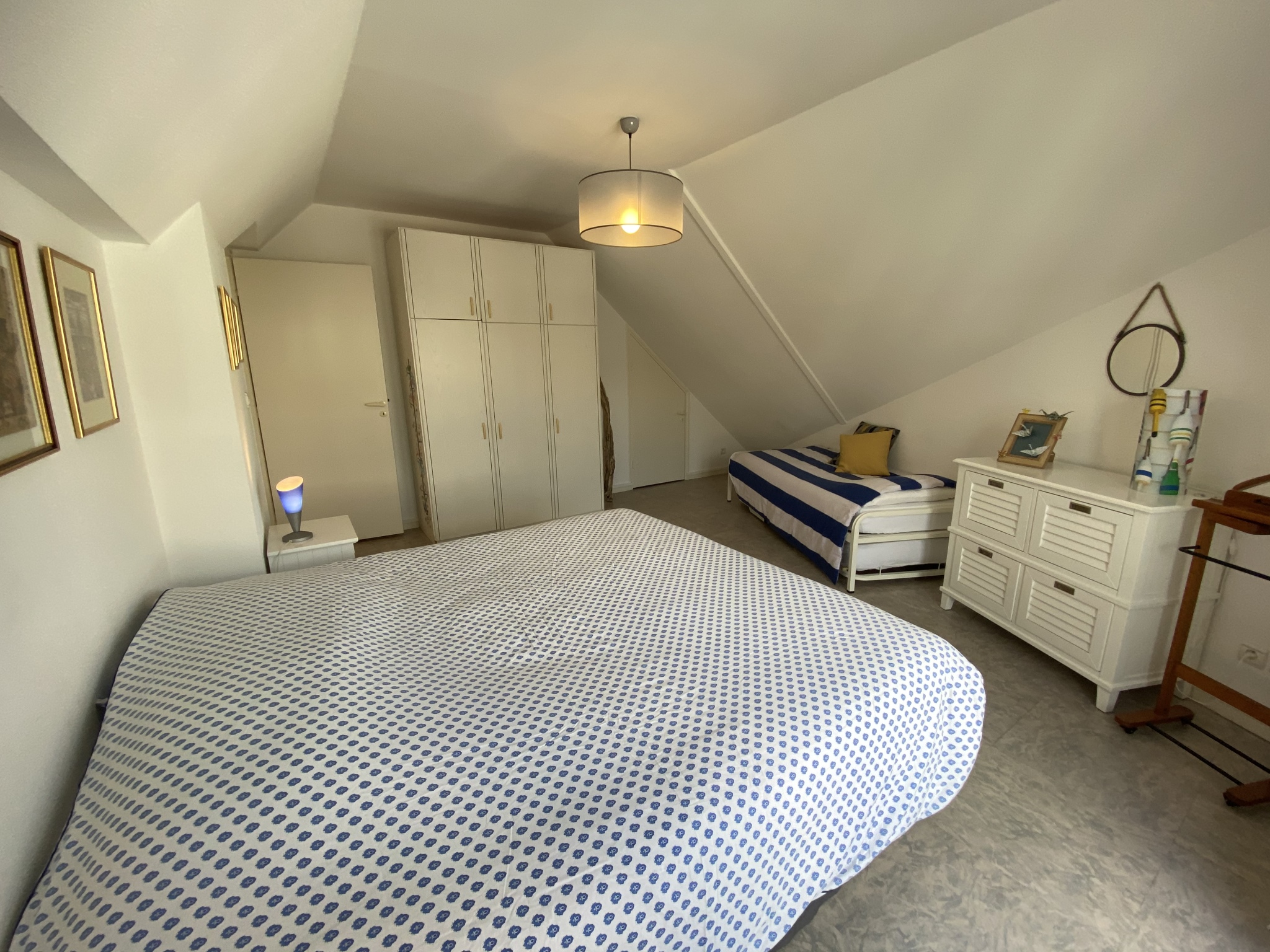 La Résidence Les Villégiales jouit d'une situation centrale entre bourg et plage et donne à cet appartement T3 situé au dernier étage avec ascenseur et garage un atout extraordinaire. L'entrée est doté d'un placard, le spacieux séjour/salon donne sur une terrasse vue mer, la cuisine est indépendante aménagée et équipée (frigo, plaques, four, micro-ondes) Une première chambre avec un lit 180 et une seconde chambre avec un lit 140 et un lit 90, salle d'eau et WC. En sus, WIFI et garage à disposition.